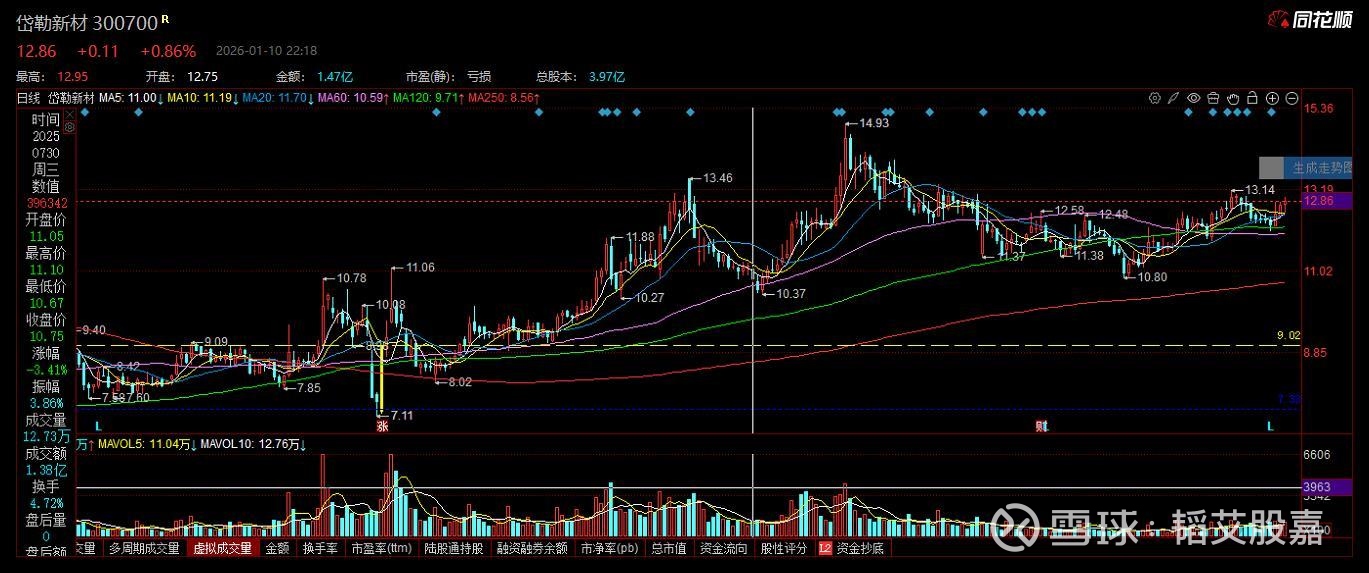 300700 岱勒新材,无涨停基因。公司基本面较差,估值较高,技术走势较强。推荐时间:2026年1月10日, 推荐股价:12.86元