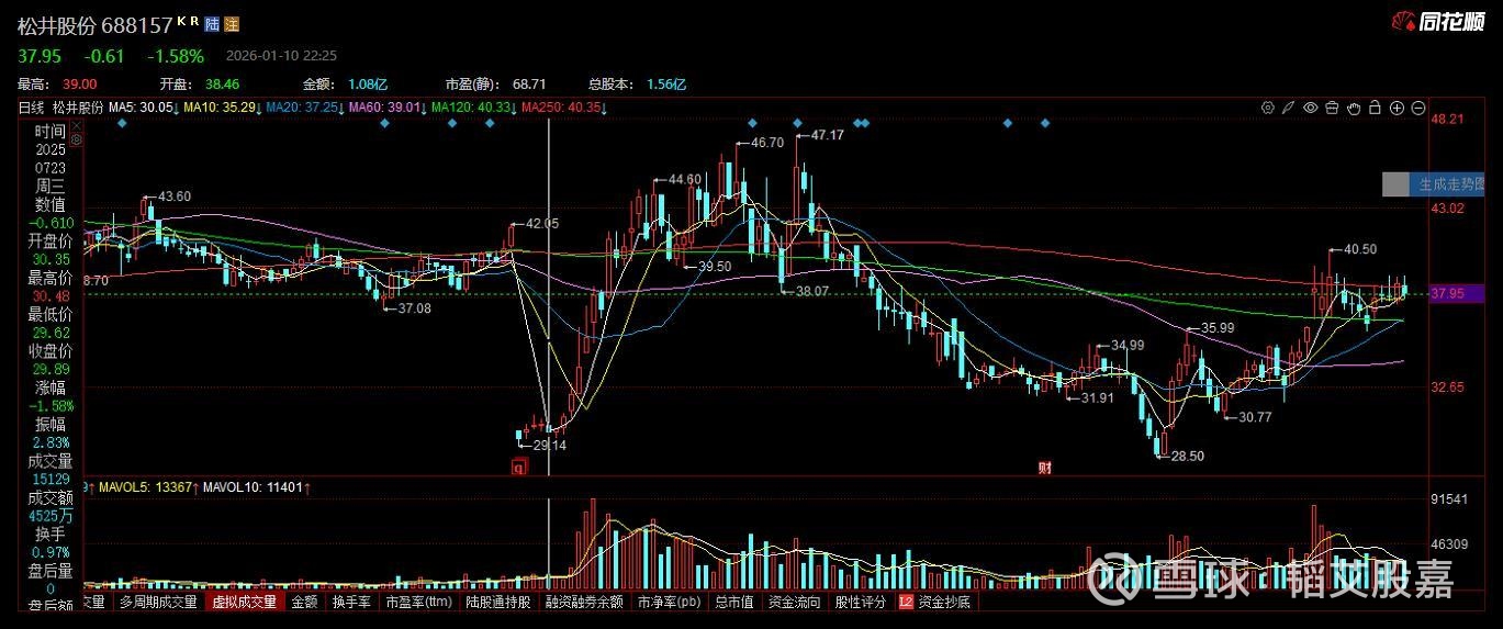 688157 松井股份,无涨停基因。公司基本面较好,估值较好,存在低估,技术走势稳健。推荐时间:2026年1月10日, 推荐股价:37.95元