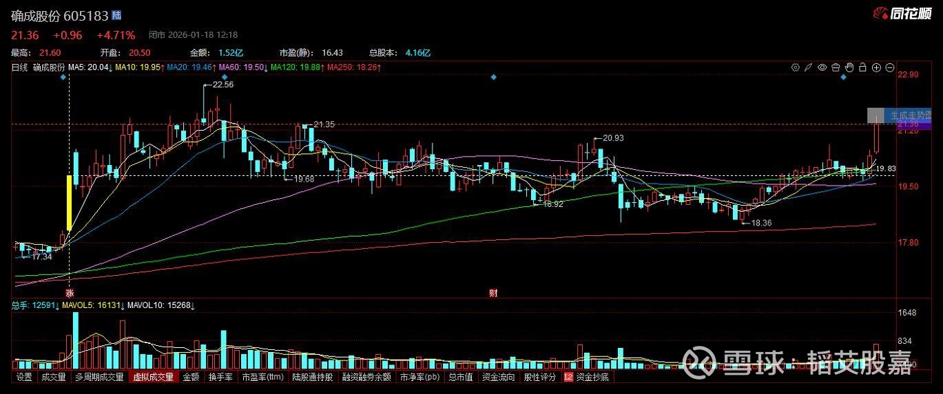 605183 确成股份,具有涨停基因(化工+专精特新)公司基本面很优秀,估值有一些性价比,技术走势较强,积极关注。推荐时间:2026年1月18日,推荐股价:21.36元。$确成股份(SH605183)$