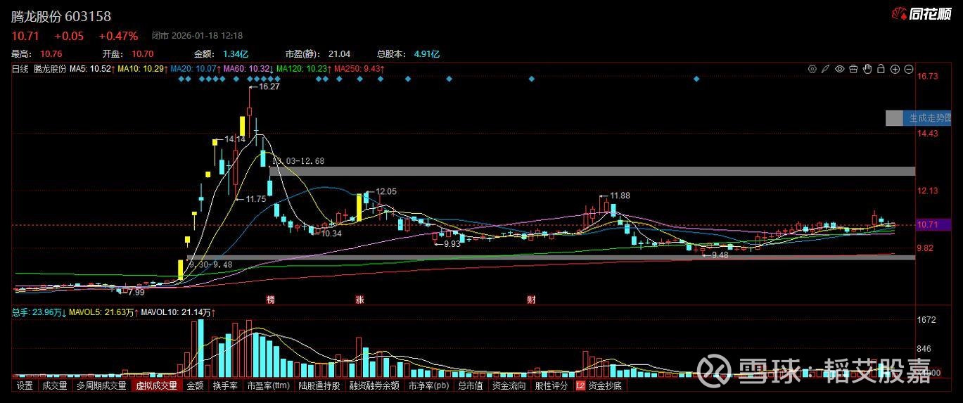 603158 腾龙股份,具有涨停基因(液冷+储能+传感器+新能源汽车),公司基本面一般,估值有一定性价比,技术走势温和上升,关注。推荐时间:2026年1月18日,推荐股价:10.71元。$腾龙股份(SH603158)$