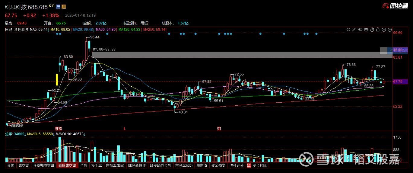 688788 科思科技,具有涨停基因(航天军工+军工电子+人工智能),公司基本面较差,估值显然非常高,技术走势震荡向上,保持关注。推荐时间:2026年1月18日,推荐股价:67.75元。