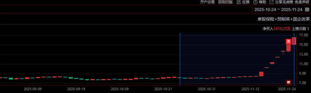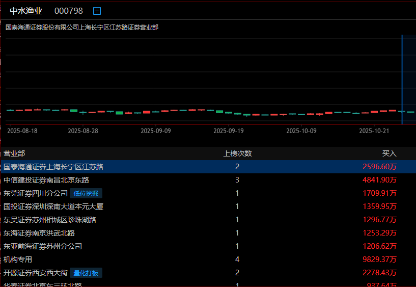 从龙虎榜数据来看,其大笔买入中水渔业的时点是在11月21日,当日买入1709.91万,卖出294.19万,净买入1415.72万。
