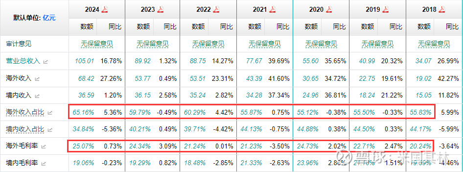 国外收入欧美客户买单最多,毛利率和收入占比逐年增加。