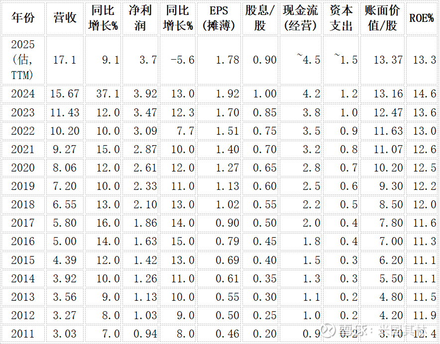 ROE:13.3%(2025 TTM,历史平均12-14%,衰退期表现稳定,如2023仍13.6%)。