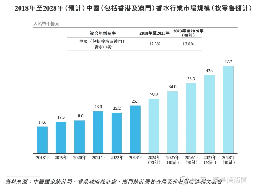 根据弗罗斯特沙利文的数据,中国(包括香港及澳门)香水总市场规模(按零售额计)由2018年的人民币146亿元增加至2023年的人民币261亿元,复合年增长率约为12.3%,预计2028年将进一步增长至人民币477亿元,2023年至2028年复合年增长率约为12.8%。