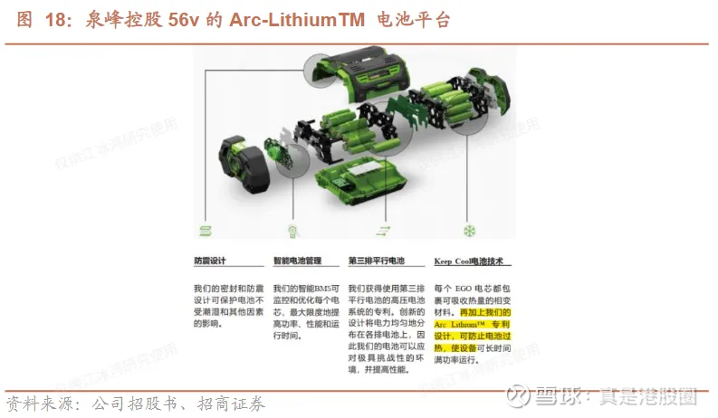1、Arc-LithiumTM 电池平台——公司推出了市面上第一款“弧形”差异化产品,在散热、防潮防震、续航等性能方面具有明显优势。在电池平台内部,公司产品使用高能量密度电芯,并将这些电池封装为模块,进一步采用智能电池管理系统( BMS)对各个电芯进行监控和优化,同时采用Keep cool 电池控温专利技术实现高精度温度控制。EGO的56V电池还可在其全系列OPE产品中通用。