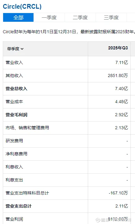 而Circle的业绩敏感性也好分析,比如利率从4%掉到3%,基本就是营收下滑25%,下滑到2%,就是少一半,那目前公司的利润呢?根据Q3的财报,7.4亿营收,2.1亿利润。商业模式看利润率还行,但仔细一算,7.4亿营收下滑25%,那就利润归零了,而更有意思的是,这个Q3的利润也是做出来的,有一些公允价值调整和税收收益,真实利润是1亿。
