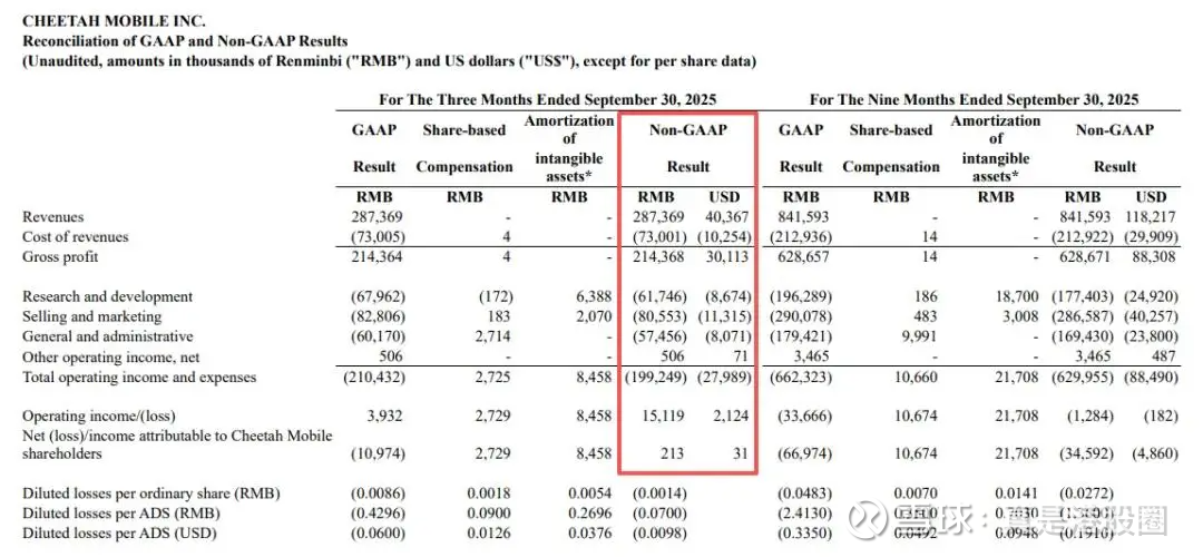 猎豹目前正处于极具标志性的盈利反转阶段,2025年Q3财务数据已明确验证盈利拐点,实现六年来首次季度Non-GAAP层面运营盈利,达1500万元人民币,相比去年同期及上一季度的运营亏损实现大幅改善,盈利拐点清晰可见。这一成绩并非短期偶然,而是公司长期优化业务结构、严控成本费用、提升运营效率的必然结果。