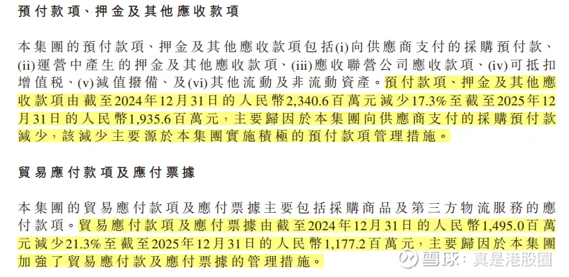 如果进一步看资产负债表里的细项,这种改善其实更清楚。首先,预付款项、押金及其他应收款项从 2024 年末的 23.41 亿元降至 2025 年末的 19.36 亿元,同比下降 17.3%,公司在年报中明确解释,主要是因为向供应商支付的采购预付款减少,背后反映的是其对预付款项管理更积极。