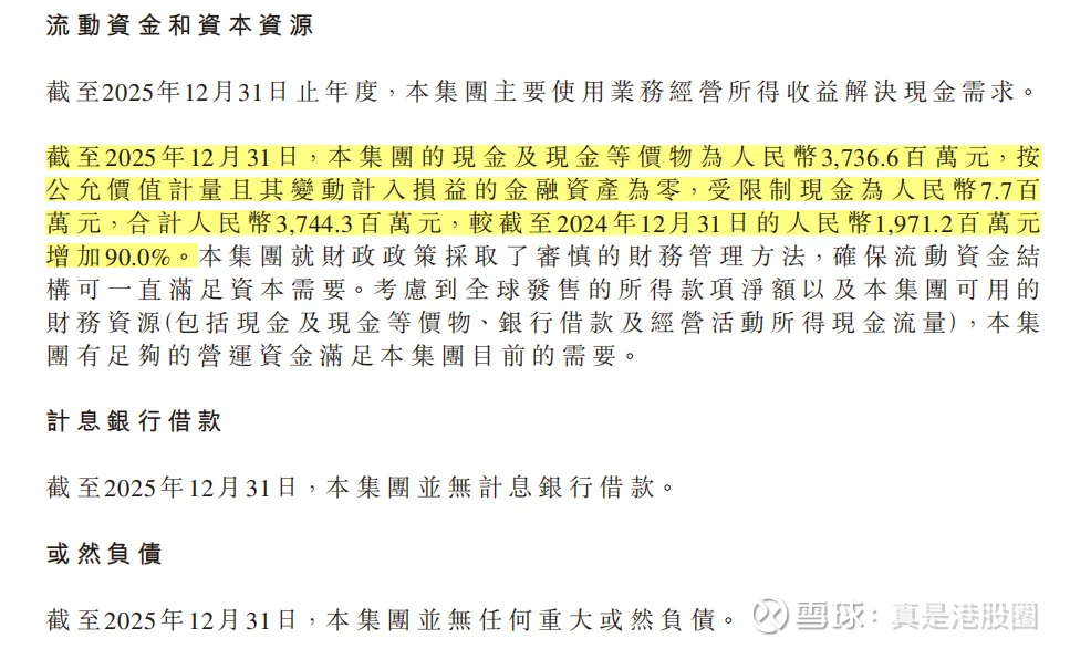 从财务上看,到 2025 年末,公司现金及现金等价物为 37.37 亿元,连同受限制现金合计 37.44 亿元,同比增长约 90%;资产负债率从 43.7% 降至 35.8%;截至年末没有计息银行借款。