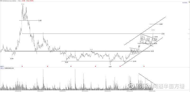 西麦食品,周五是底开高走、冲高回落。不过这个回落问题不大,前面已经说了。底部坚实、调整充分——C罩杯的旗形整理。而且它这个动作之前在16附近往上突破的时候就玩过一次,其实说实在的包括它这一波调整的感觉都跟之前在16附近的调整类似。如果说真的有操盘的人,那这人都没换……