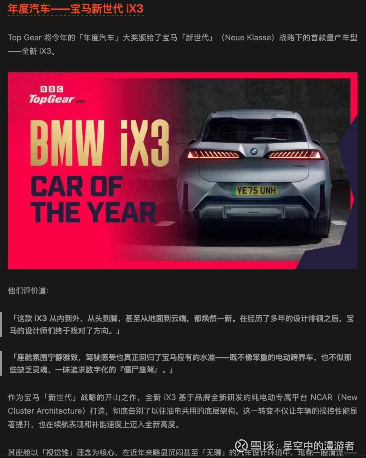 这一年,账户曲线并不总是顺滑,却像东北冬天的风,来得直、去得快,之后是更澄明的天空。回望起点,我只是把一枚筹码,押在确定性的现金流和技术周期即将翻页的交汇处。前天,Top Gear 将年度汽车桂冠递给了宝马新世代的首款量产车——全新 iX3;奖杯在镁光灯下发亮,也把我手里这只$华晨中国(01114)$ ,照得格外从容。TopGear用“wholly new… ground to cloud(从地面到云端,焕然一新)”来形容这台车,言外之意,是体系之变而非零件之加。