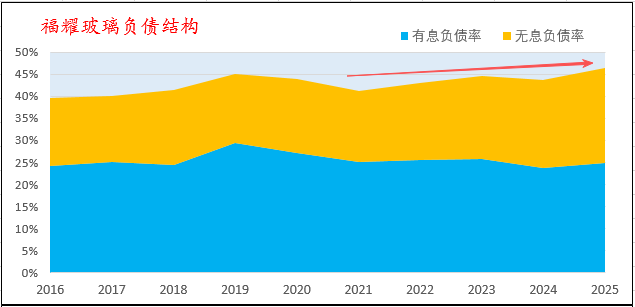 福耀玻璃资产负债率近十年在40-46%之间波动,最近几年低位略有上升。对负债拆解来看,有息负债(兰色区域)一直控制在23.7-30%之间,自2019年处于稳中有降的趋势,2025年有息负债率几乎在底部位置的24.8%。而负债率增量来自于无息负债,2025年无息负债率来到了历史新高的21.6%。所以说,资产负债率的增加并没有增加财务成本,也并没有增加财务风险。