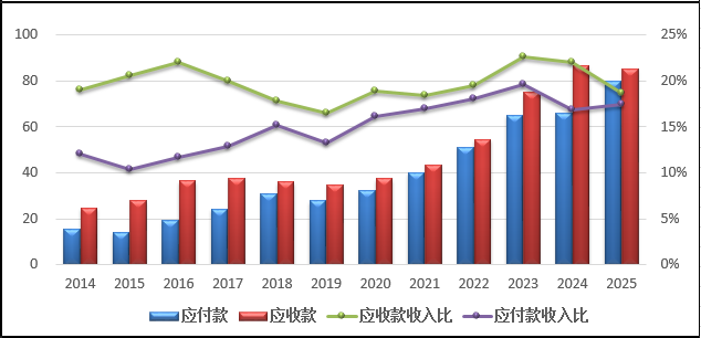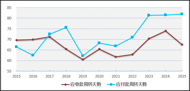 福耀玻璃属于汽车产业配角,对整车厂会有不小的应收款,但收入占比和账期可控,且低于同行业,说明在汽车玻璃行业具有较强竞争力。其次,在上游也具有一定的话语权,表现在大量的应付款上。至2025年,应付已经接近于应收规模,其占款系数在历史高位的1附近,这表明福耀玻璃的营运资金处于一个平衡状态。从周转天数来看,应收款处于加快、应付款持平状态,后续趋势需进一步观察验证。