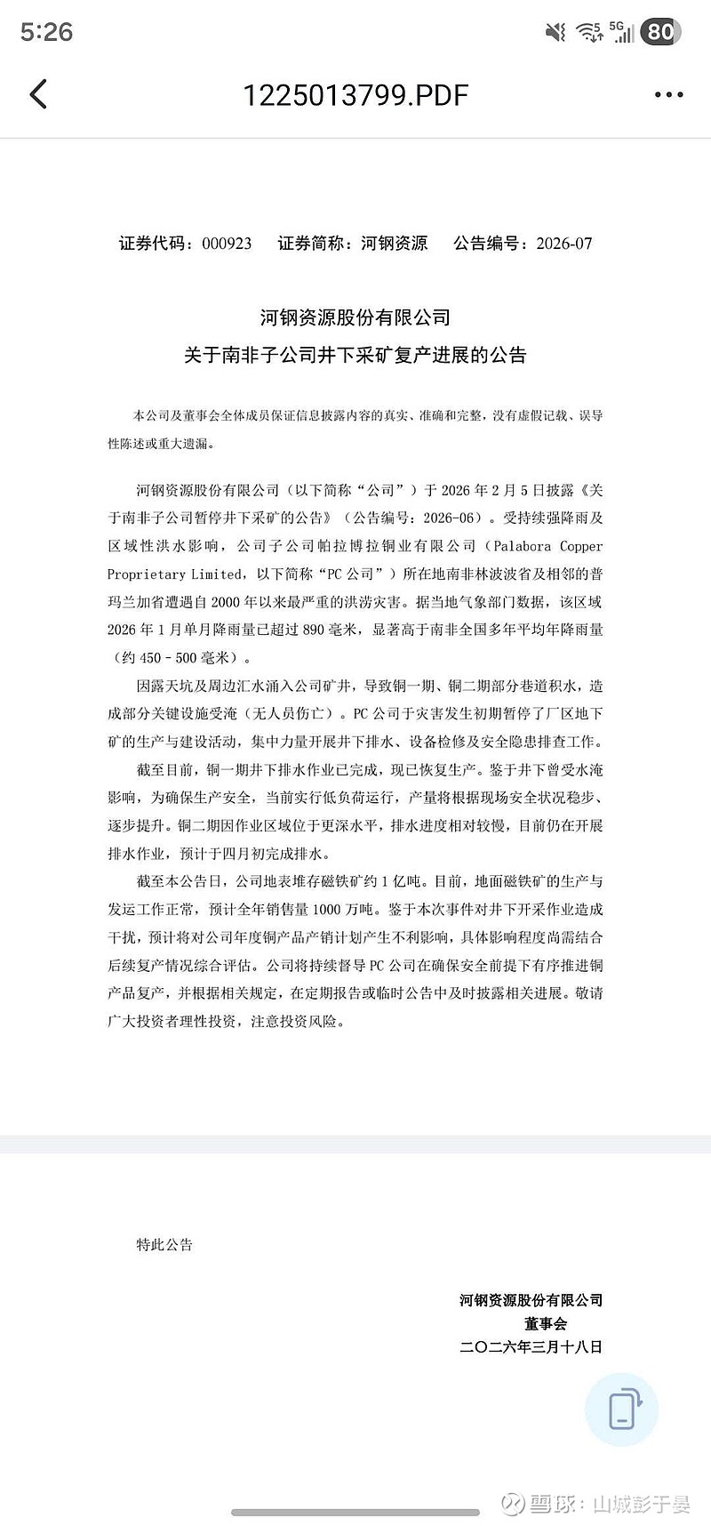 $河钢资源(SZ000923)$ 铁矿石业务不受影响,算是利好了,最近中国矿业资源集团和必和必拓的长协价格谈判进入胶着状态,有小道消息称国内现在限制纽曼粉的进口,进一步推动铁矿石价格上行,一二季度的业绩应该稳中有升,基本盘算是保住了,铜一期目前缓慢复工也给业绩带来了一定增量,铜二期4月底也有希望复产,原计划三四季度达产的计划应该会推迟一个季度,总体来说受这次洪灾影响,没有暴雷已经是不幸中的万幸的,这则公告也算是给股东们吃了个定心丸了