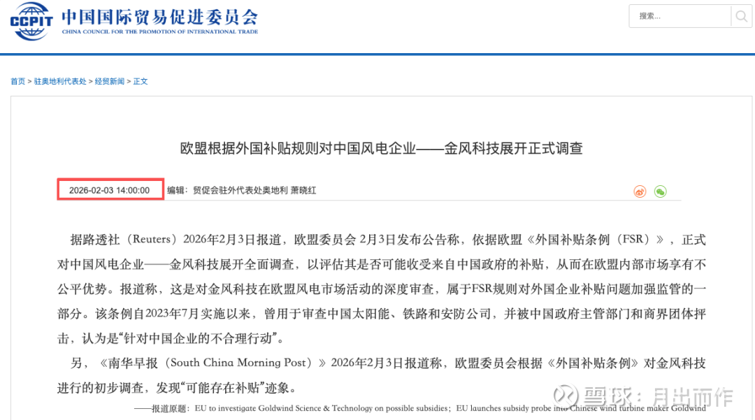 此次调查是评估金风科技是否可能收受来自中国政府的补贴,从而在欧盟内部市场享有不公平优势。
