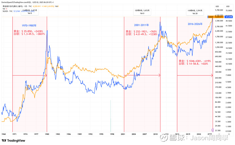 历史回顾:1970-1980年:黄金:35-850,+2328%,白银:1.3-49.5,+3707%;2001-2011年:黄金:252~1921,+665%,白银:4.0~49.5,+1138%;2016-2026年:黄金:1046-4381,+319%,白银:14~58.8,+320%。以上仅从统计角度分析,历史不代表未来,仅供参考。