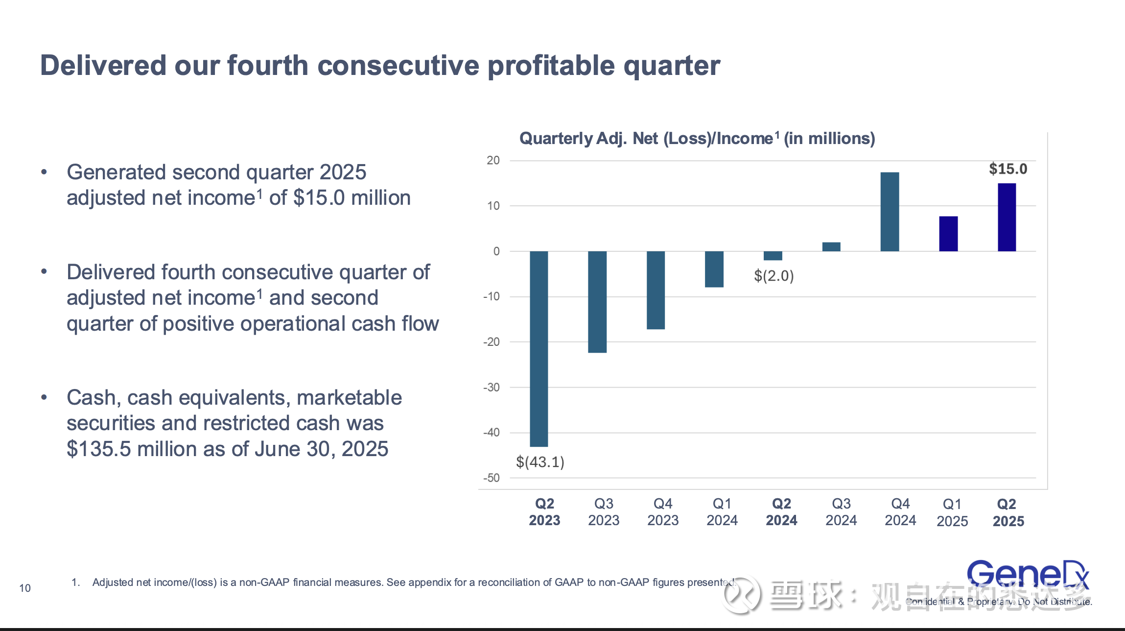 最新的2025年第二季度财务收入为1.027亿美元,首次实现超过1亿美元的季度营收,同比增长49%,实现了里程碑式的增长。其中外显子组和全基因组营收为 8590 万美元。也达到历史新高,同比增长69%,检测数量同比增长28%。本季度平均报销率达每次检测 3700 美元以上,高于第一季度的 3400 美元。