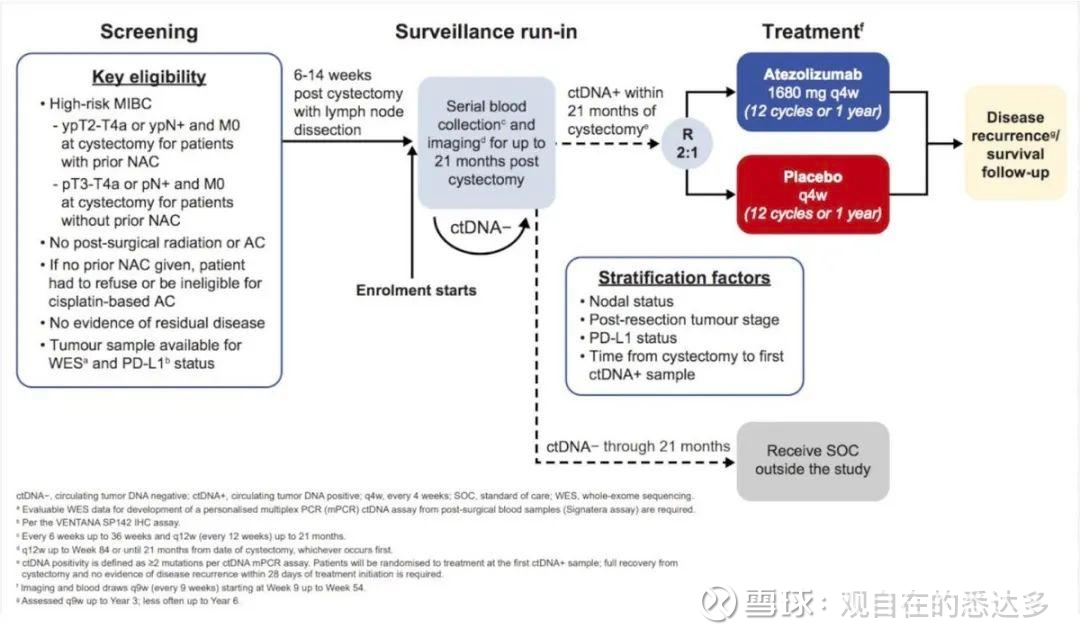 IMvigor011是首个采用个性化 ctDNA MRD 引导方法的肌层浸润性膀胱癌前瞻性 III 期研究,该研究采用Natera的Signatera产品进行ctDNA 检测,对肌层浸润性膀胱癌 (MIBC)患者进行术后血液中的分子残留病灶 (MRD) 检测,并预测哪些患者将受益于癌症免疫疗法阿特珠单抗 (Tecentriq®) 的辅助治疗。约 760 名患者参与了该试验的监测阶段,并在术后长达 12 个月内接受了连续的 Signatera 检测。如果患者 Signatera 检测结果呈阳性且影像学检查未发现癌症复发,则随机接受阿特珠单抗或安慰剂治疗,治疗期间每 4 周进行一次,持续 12 个周期或长达一年。Signatera 检测结果持续呈阴性的患者不接受随机治疗,但将继续接受影像学检查和 ctDNA MRD 检测的随访。