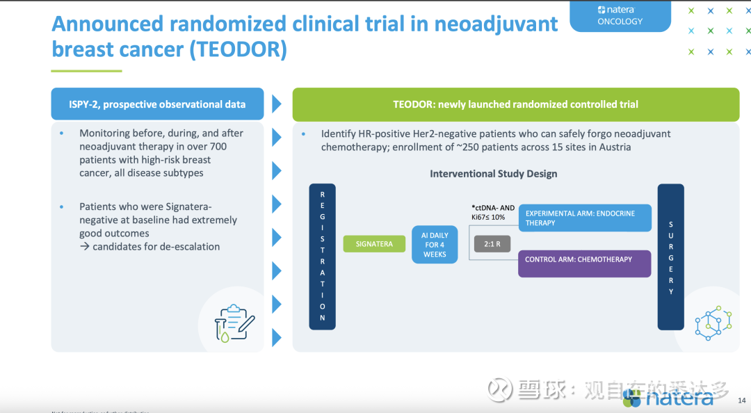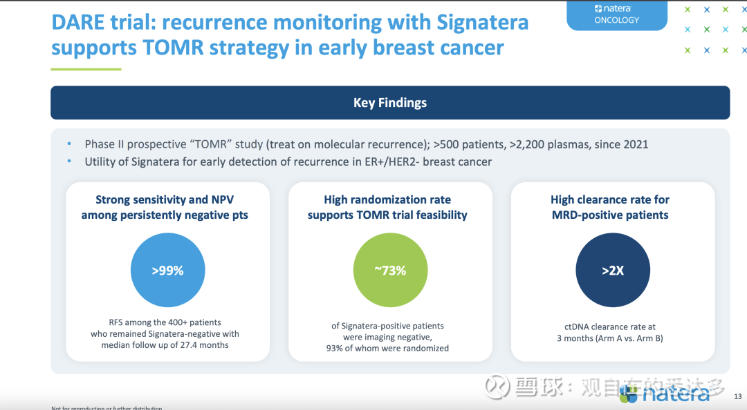 乳腺癌:DARE 试验(一项 II 期前瞻性“分子复发治疗”研究)中期结果显示,连续检测呈阴性的患者预后极佳(超过 99% 的患者未复发),且 Signatera 检测到的复发中有 73% 仅与分子水平相关。此外,ISPY-2 试验的新数据表明基线 Signatera 阴性的患者预后极佳,这促使 TEODOR 试验的启动,以研究是否可以安全地避免化疗。
