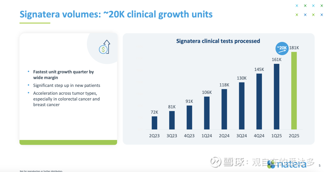 本季度 Signatera 销量环比增长了 2 万例,显著超越了公司此前的增长纪录,是公司的一个新的里程碑。前四个季度的平均增长量约为每季度 1.3 万例。从这个图里可以近似的推出,从2022年Q2至今,Signatera大约有37万例的检测量,就MRD的销量来讲,是一个惊人的数字了。
