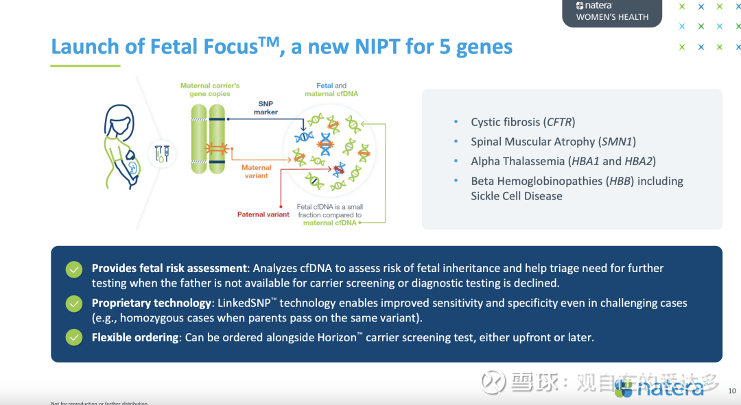 新产品发布:Natera推出了用于遗传性疾病的全新胎儿焦点无创产前检测 (Fetal Focus NIPT),该检测利用专有的 LinkedSNP 技术,能直接通过母体血液样本评估婴儿遗传疾病的风险,也是一个非常有意思的检测,包括了常见的罕见病。