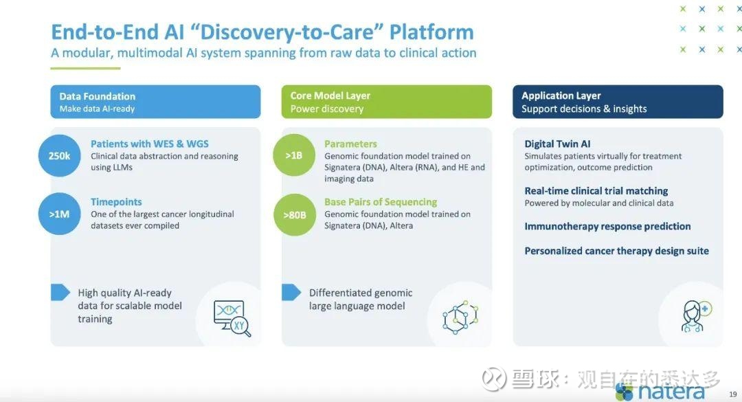 AI “从发现到护理”平台:Natera 宣布推出基于人工智能的“发现到护理”平台,旨在支持从早期靶点发现到临床决策支持的各个治疗开发阶段。该平台由三个部分组成:基因组和临床数据基础层(涵盖超过 25 万名患者和超过 100 万个纵向时间点,以及抽象的临床数据和药物治疗及疗效信息,构成迄今为止规模最大的多模态纵向肿瘤学数据集之一),核心模型层(基于去识别化的 Signatera 和 Altera 数据训练的多模态基础模型,包含超过 10 亿个参数),以及应用层(支持临床决策并提供基因组洞察)。