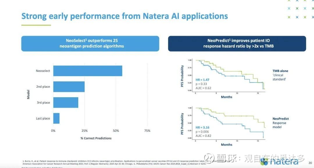 免疫疗法反应预测与新抗原识别:Natera 开发了 NeoPredict 算法用于识别可能对免疫疗法产生反应或耐药性的患者,以及 NeoSelect 算法用于识别潜在的新抗原突变。NeoSelect 在识别高优先级新抗原方面,优于 25 个现有模型,并且比排名第二的模型高出约 2 倍。NeoPredict 在 Natera 的 BESPOKE IO 临床研究中,其肿瘤突变负荷预测结果显著优于其他方法。