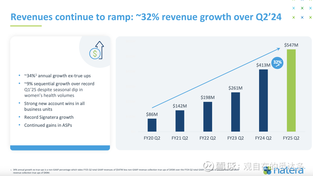 Natera 在 2025 年第二季度总收入达到 5.47 亿美元,比去年同期增长了 32%。剔除实际收入调整后,同比增长率为 34%。这一数字超过了分析师平均预期的 4.768 亿美元。与 2025 年第一季度相比,总收入环比增长 9%,有机增长 7%。