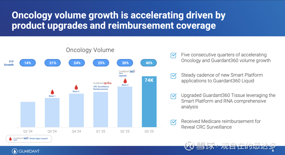 Guardant Health第三季度收入达2.65亿美元,同比增长39%,超出分析师预期,公司全年营收有望首次突破10亿美元。增长主要来自肿瘤业务(包括Guardant360 Liquid等),销量同比增长40%。