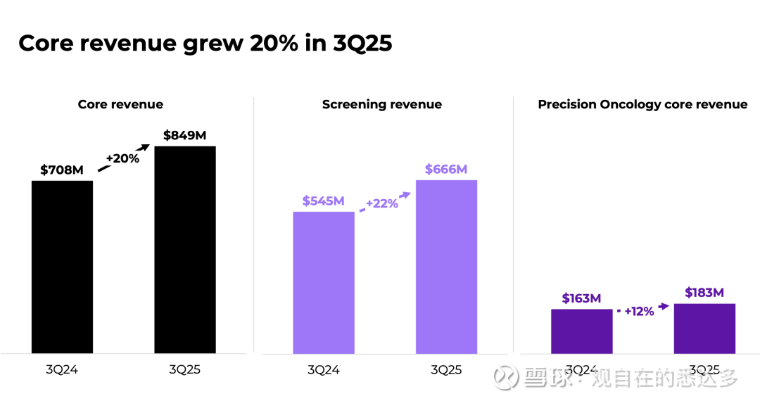 第三季度,公司总营收8.51亿美元,同比增长20%,为近两年来最高季度增速。筛查收入6.66亿美元,精准肿瘤学收入1.83亿美元。EBITDA同比提升200个基点至1.35亿美元,但仍录得净亏损1900万美元;前三季度累计亏损12.1亿美元,亏损幅度较去年收窄。