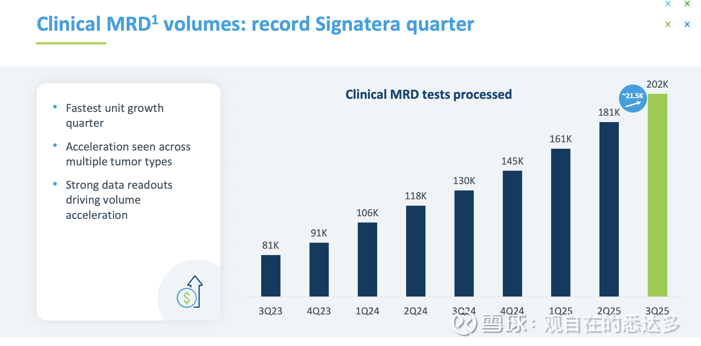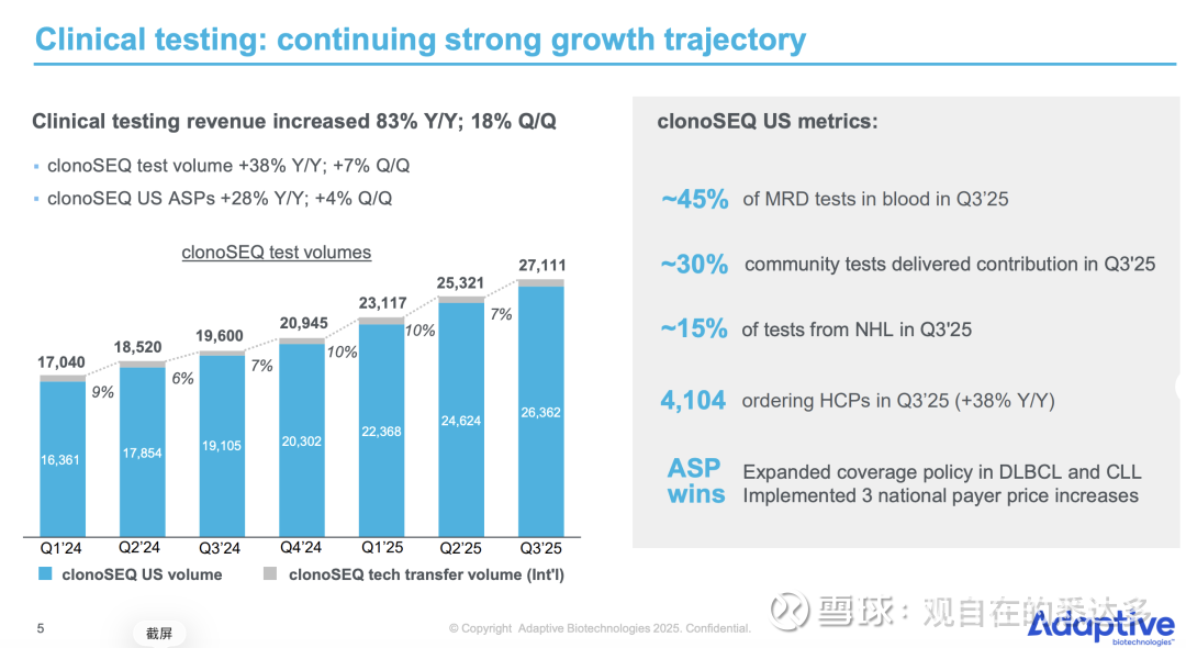 核心业务MRD(ClonoSeq)占总营收约60%,受检测量与ASP提升带动实现强劲增长。本季度公司实现正现金流,这是MRD业务首次现金流转正。