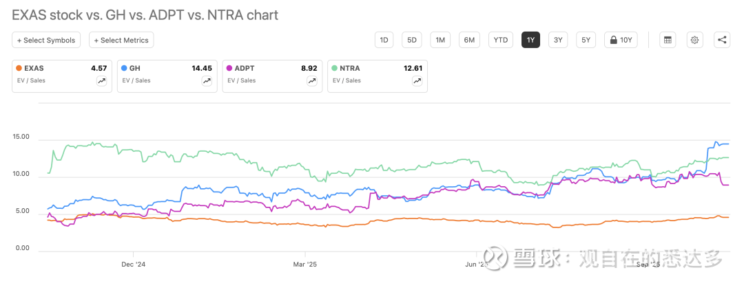 由估值水平(EV/Sales)来看,目前GH为14.45倍,NTRA为12.61倍,ADPT约8.9倍,而EXAS仅为4.6倍。换句话说,GH和NTRA的市场定价已显著领先同业,而EXAS仍处于相对低估区间。