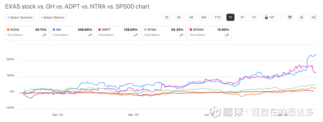 Guardant Health(GH)年涨幅约240%,表现最为强劲;Adaptive Biotechnologies(ADPT)上涨约128%;Natera(NTRA)上涨约52%;Exact Sciences(EXAS)则相对温和,仅上涨约32%。