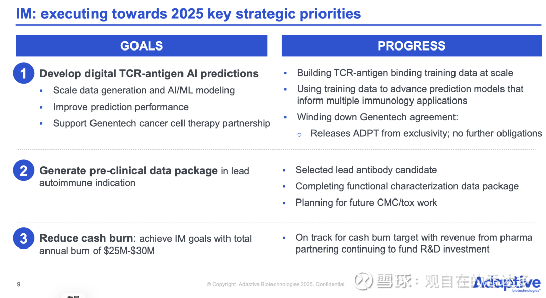 Adaptive的战略重心正在从研发驱动向盈利导向过渡。公司此前在免疫药物发现领域投入巨大,如与基因泰克合作开发TCR个体化疗法,但由于投入过高,管理层已决定缩减此部分支出,聚焦现金流改善。