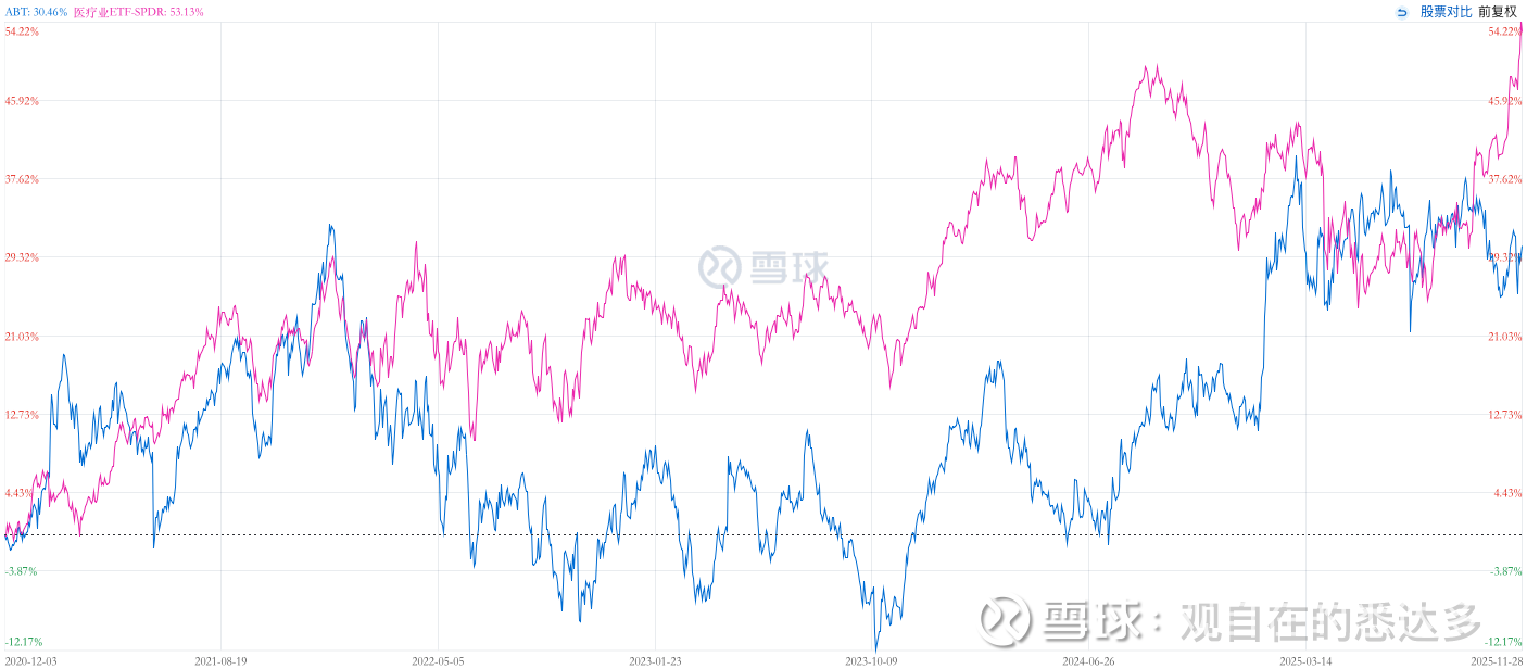 雅培一直被视为医疗健康板块的“避风港”。其业务版图——从价值 190 亿美元的医疗器械(涵盖心血管、糖尿病)到近百亿的诊断与营养业务——构建了极强的抗周期能力。过去十年,凭借内生增长与精准并购,雅培销售额翻倍,且将股权稀释率控制在令人惊叹的 15% 以内。这种“稳稳的幸福”早已被市场充分定价,股价在五年间一直维持在 23-24 倍市盈率的高位震荡。然而雅培近五年的股价涨幅(30.45%)低于医疗行业ETF-XLV(53.13%),