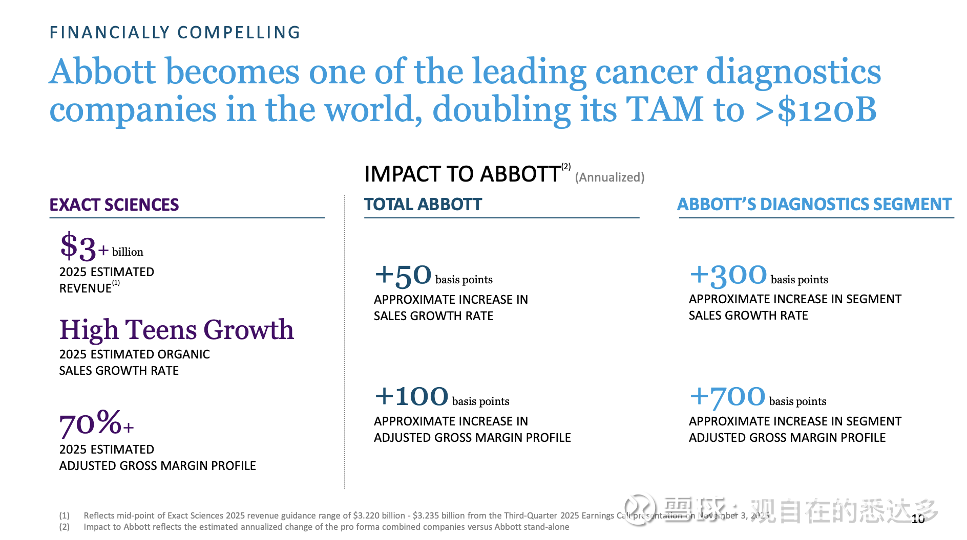 Exact Sciences无疑是癌症早期诊断检测的领先者,其Cologuard和Oncodetect业务,被认为对雅培的诊断业务贡献巨大。收购后,雅培诊断业务的潜在市场规模(TAM)预计将翻倍,从约600亿美元增至超过1200亿美元。预计将使雅培整体销售额增长率提高约50个基点(0.5%),诊断业务销售额增长率提高约300个基点(2%)。预计将使雅培调整后毛利率提高约100个基点(1%),诊断业务调整后毛利率提高约700个基点(7%)。预计到2028年,每年将带来至少1亿美元的税前协同效应。