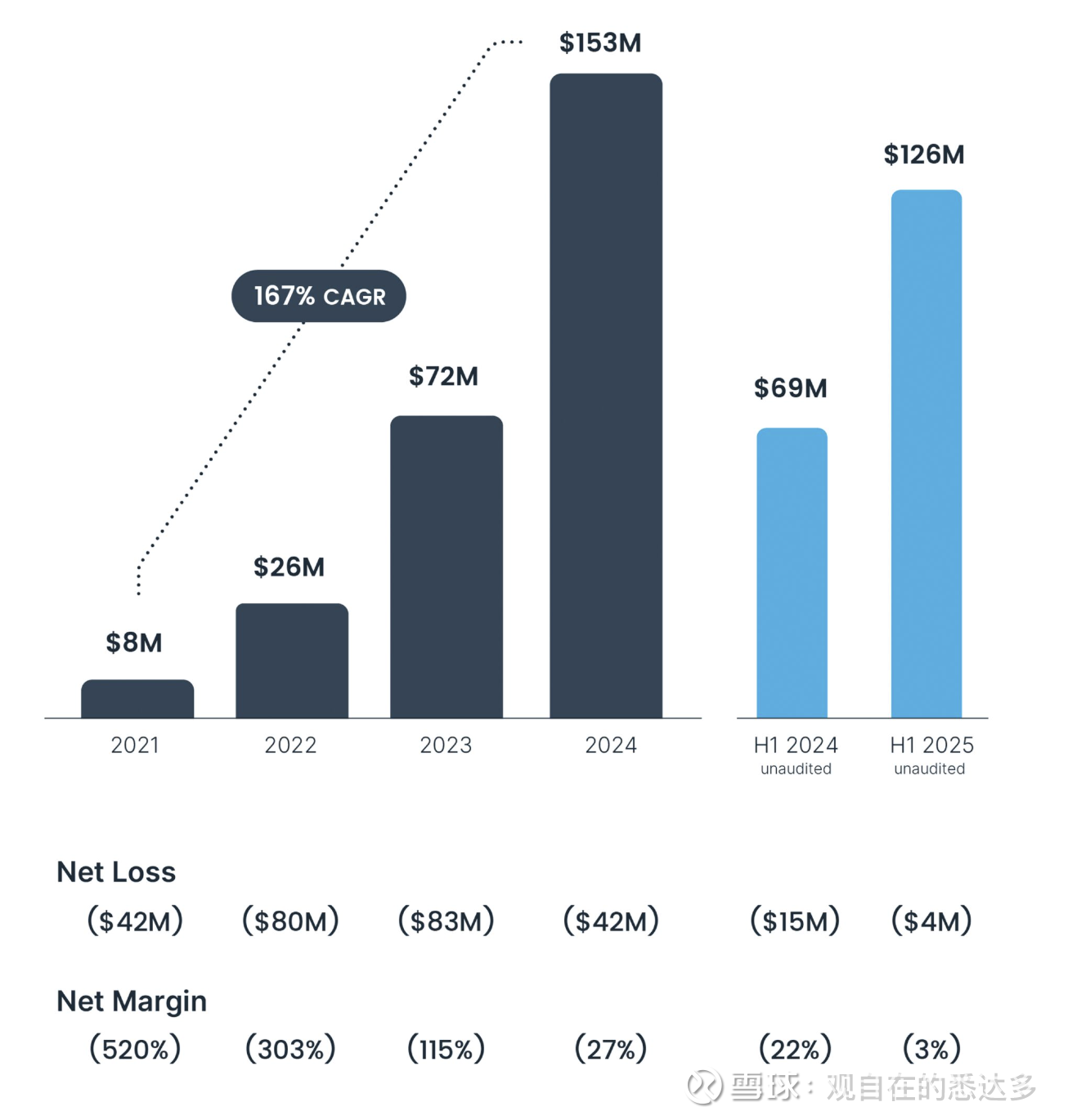 其年收入主要集中于过去1年,2023年收入7百万,2024年增长到1.53亿,同比增长113%,复合年增长率达167%。