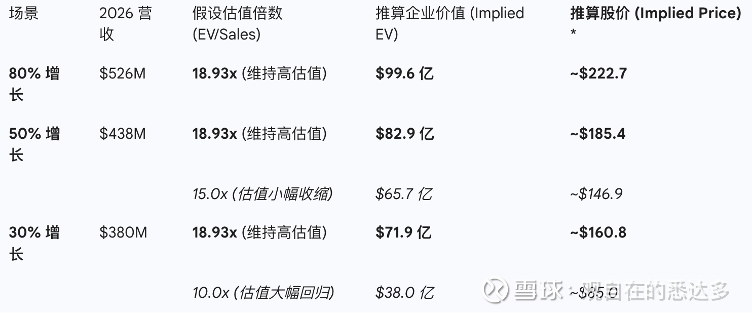 2025E 按照91%高增长假设,2026年分为乐观(80%增长),中性(50%)增长和悲观(30%)增长,其2026年营收对应分别为526M, 438M, 和380M,进而根据EV/Sales来推算其EV和股价。
