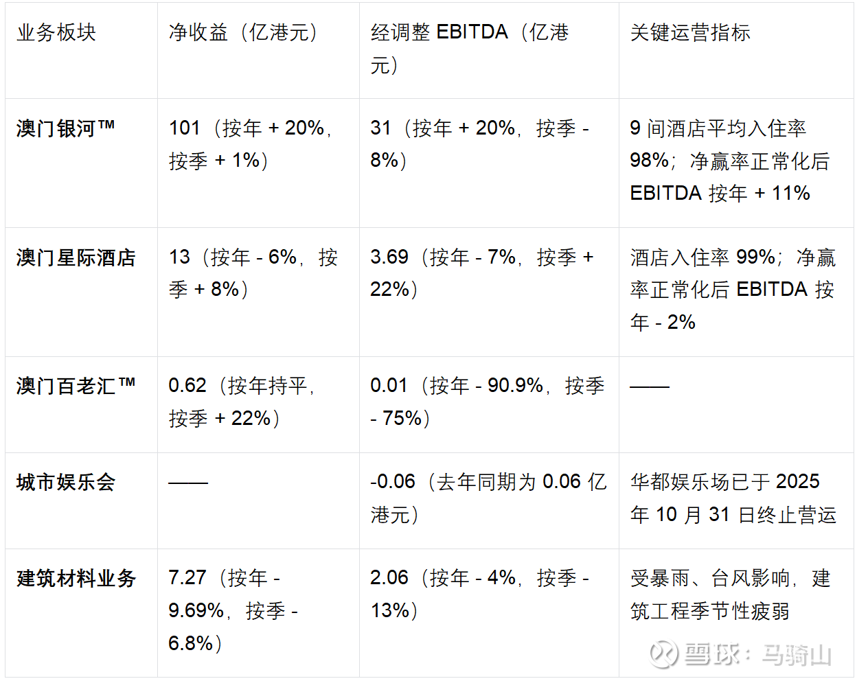 各业务板块表现差异显著,“澳门银河™” 作为集团核心增长动力,贡献主要收益与利润;澳门星际酒店、澳门百老汇等板块则面临不同程度挑战,具体数据如下表所示: