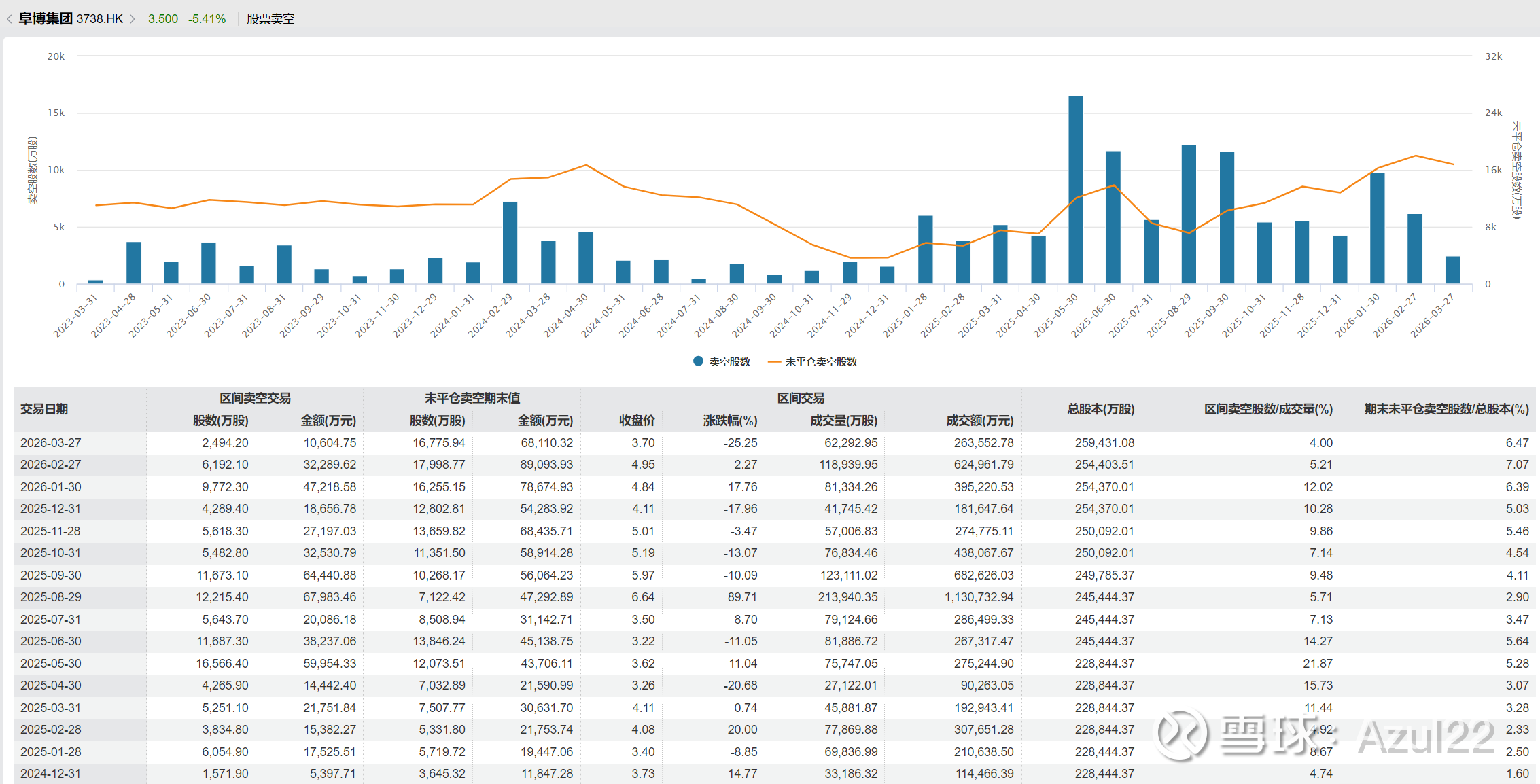 港交所的官网没有看到$阜博集团(03738)$ 的衍生权证,牛熊证,界内证,股票期权,股票期货等一些列衍生品,据此可以判断,市场公开的、标准化的看空工具极为有限,因此任何成规模的看空头寸,主要通过融券卖空来实现,即借券→卖出→形成未平仓空单。即便存在少量场外衍生品,其对冲端也大概率会传导至融券市场。