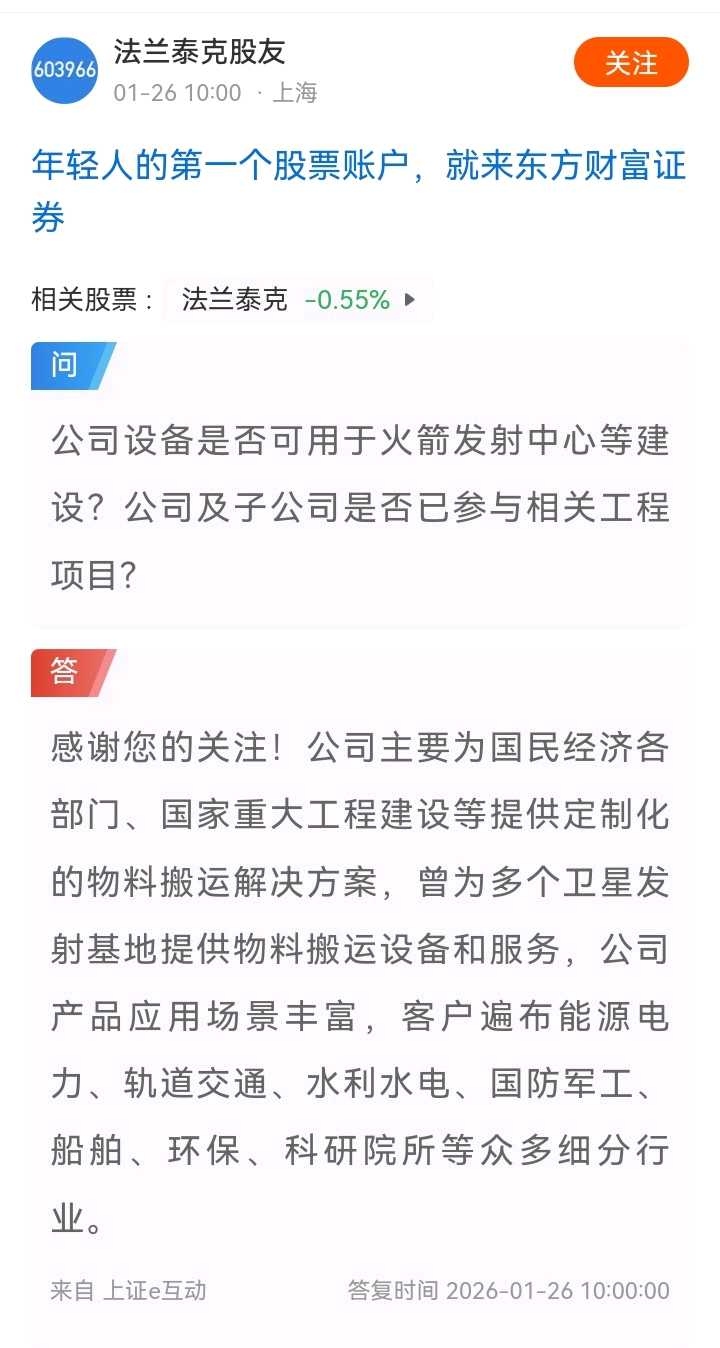 投资者在上证e互动平台问法兰泰克:公司设备是否可用于火箭发射中心等建设?公司及子公司是否已参与相关工程项目?