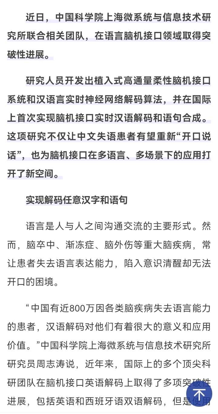 研究人员开发出植入式高通量柔性脑机接口系统和汉语言实时神经网络解码算法,并在国际上首次实现脑机接口实时汉语解码和语句合成。这项研究不仅让中文失语患者有望重新“开口说话”,也为脑机接口在多语言、多场景下的应用打开了新空间。