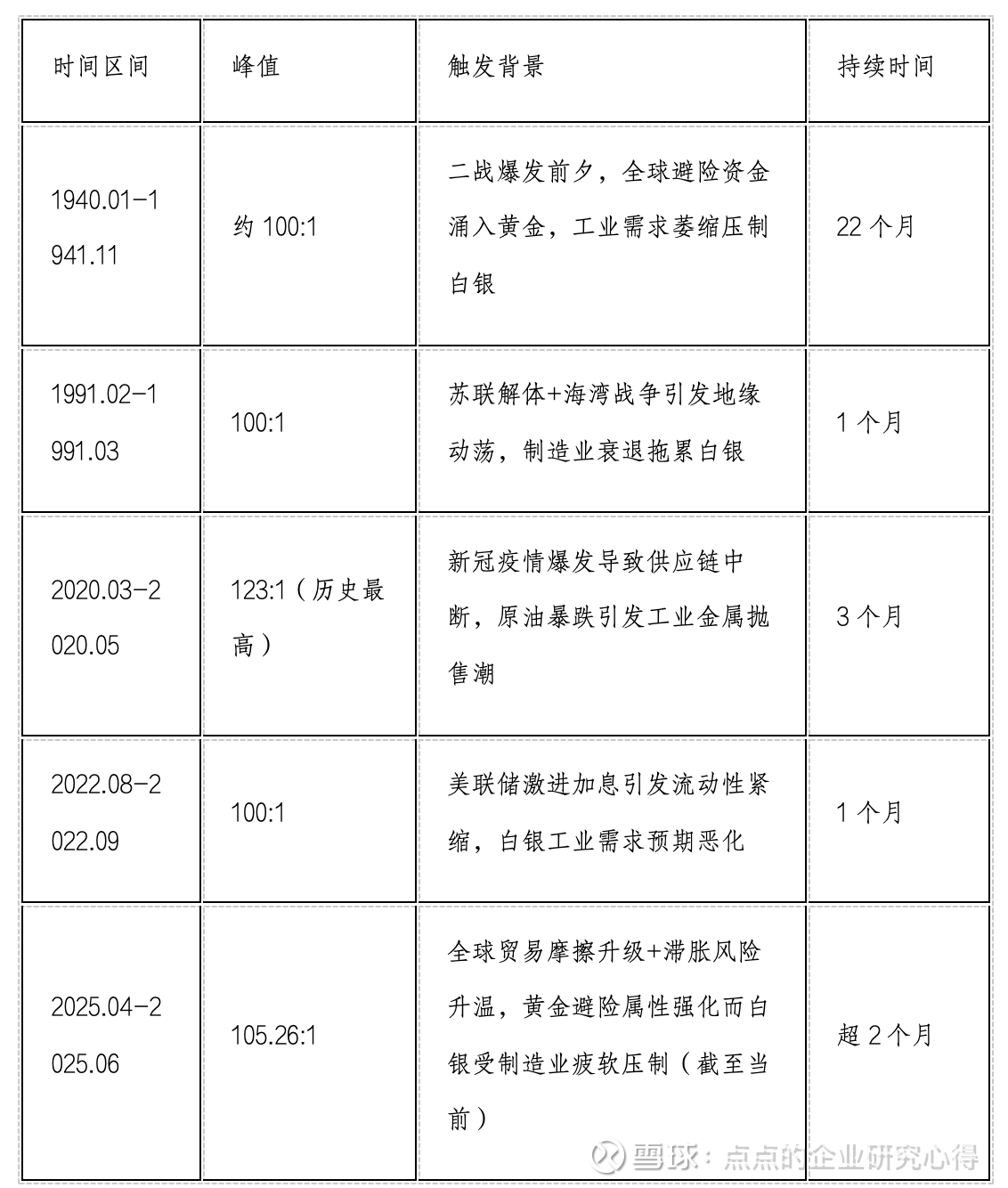 根据历史数据统计,最近100年(1925-2025年)金银比突破100的情况共发生5次,具体事件及背景如下: