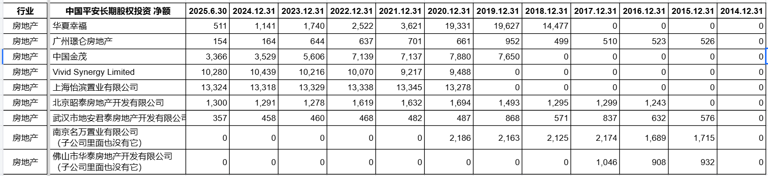 2025年华夏幸福的中报又亏损了68个亿,平安持股25%,粗略计算的话,平安投资收益里又得因为华夏幸福亏损17个亿(当然长期股权投资带来的投资收益是没有被投资公司明细的,只有账面价值也就是相当于净资产才有公司明细)。