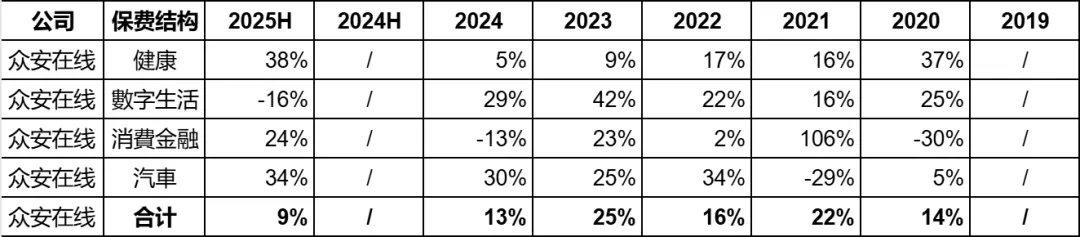 答案是:健康险以及电商相关的保险。这是我总结的从2019年到2025年众安在线的保费结构情况,见下图: