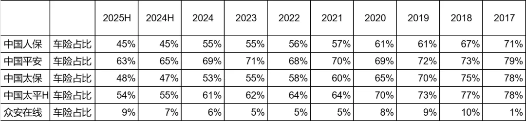 当所有财险公司都以车险为主业时,我们来看看众安的车险占比,我整理如下图: