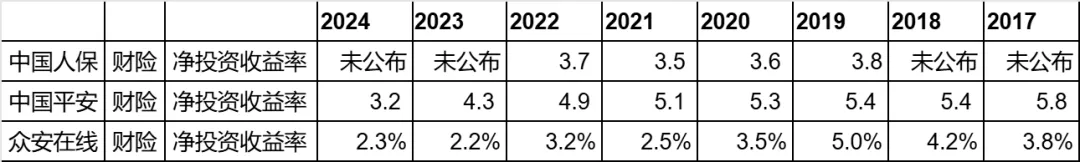1. 众安在线净投资收益率几乎年年是最低的,当然指望众安在固收上超过两大巨头,显然是不实际的。