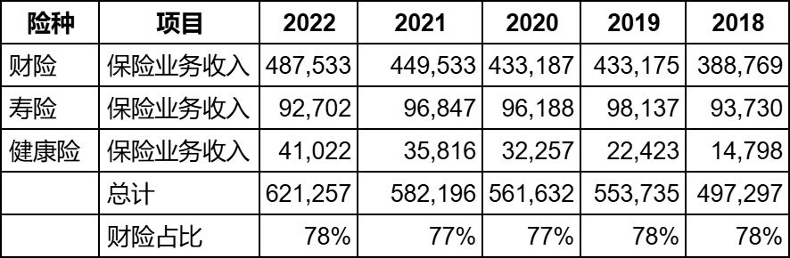 2018年到2022年,保险业务收入中财险的占比几乎没变过,都是78%左右,如下图: