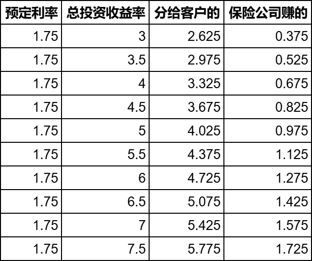 在分红险账户不同的投资收益率情况下,所对应的保险公司能赚的比例,我做了下面这张表,可以看得更清楚,可以看到,即便总投资收益率达到惊人的7.5%,保险公司也不过能赚1.725%: